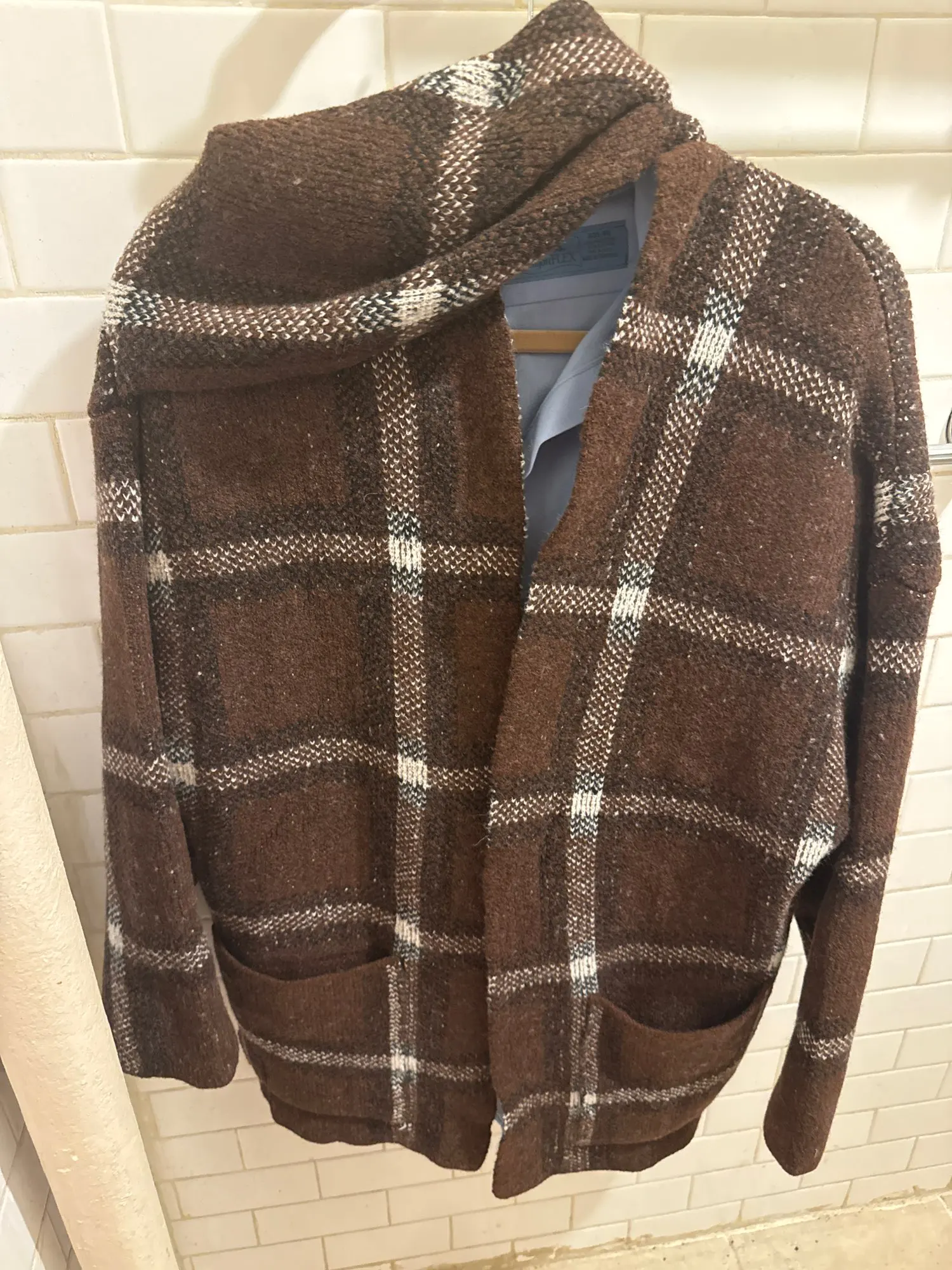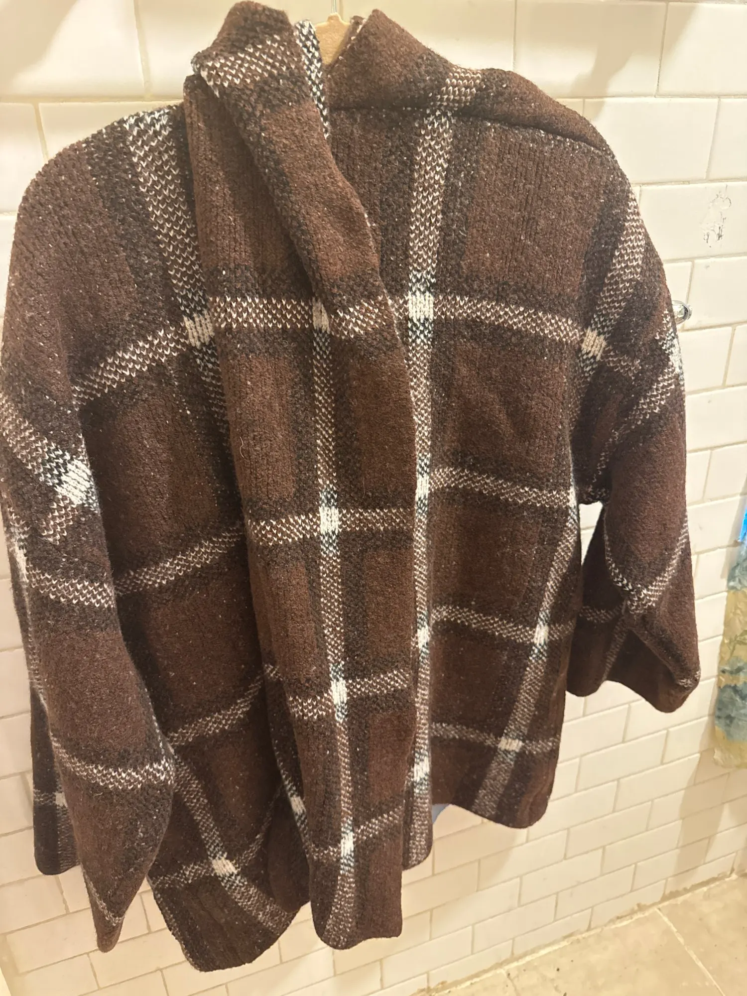 Imaginez-vous enveloppée dans un manteau court tricoté au motif carreaux brun et blanc, sublimé par un col façon écharpe intégré qui apporte une touche sophistiquée et distinctive. Son design ouvert, sa coupe régulière et ses finitions soignées créent une silhouette élégante, moderne et parfaitement équilibrée.